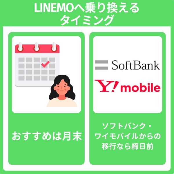 ソフトバンクからLINEMOに乗り換えるなら、締め日前または月末がおすすめです。