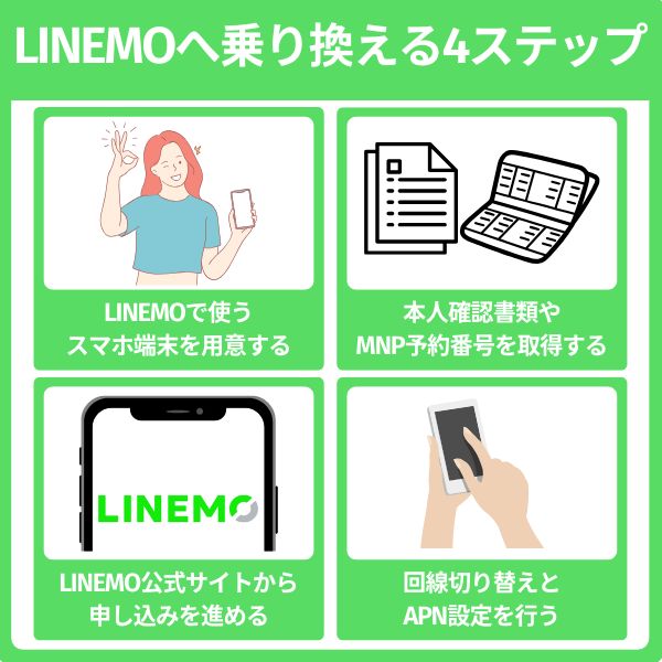 LINEMOへの乗り換えするために、具体的な手順を4つのステップで解説します。