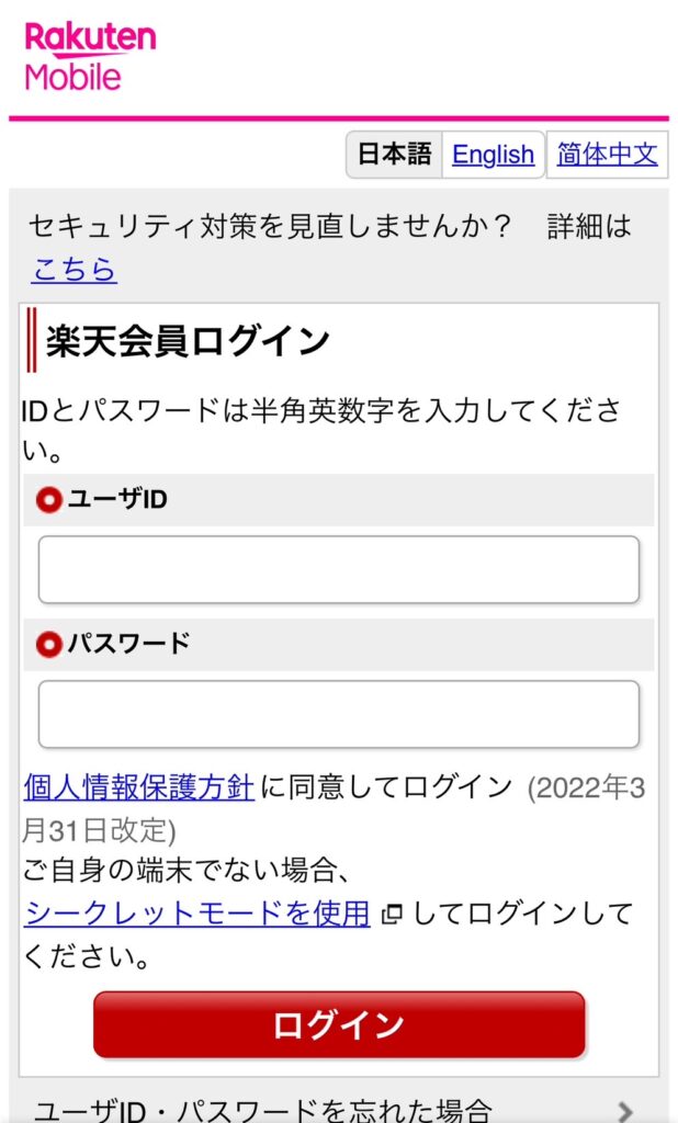 送られてきたURLをタップすると楽天会員のログイン画面が表示されます。