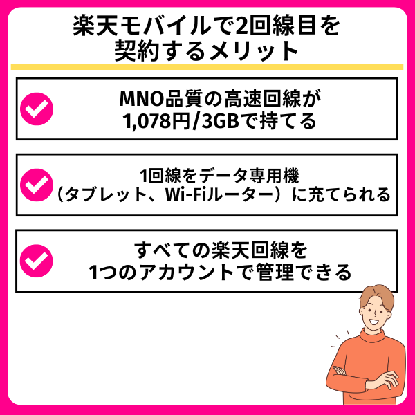 既存の楽天モバイルユーザーが他のSIMとの組み合わせではなく、あえて楽天モバイルで2回線目を契約するメリットには、以下のようなことが挙げられます。