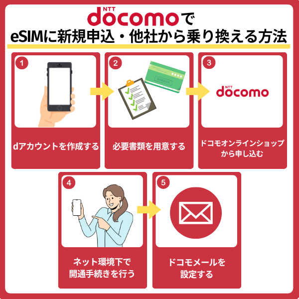 ドコモでeSIMに新規申込・他社から乗り換える方法と設定手順を以下で紹介します。