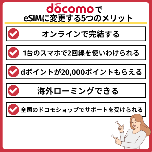 ドコモでeSIMに変更するメリットは以下の5つです。