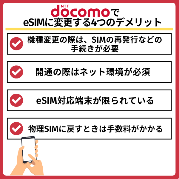 ドコモでeSIMに変更する際デメリットは以下の5つです。