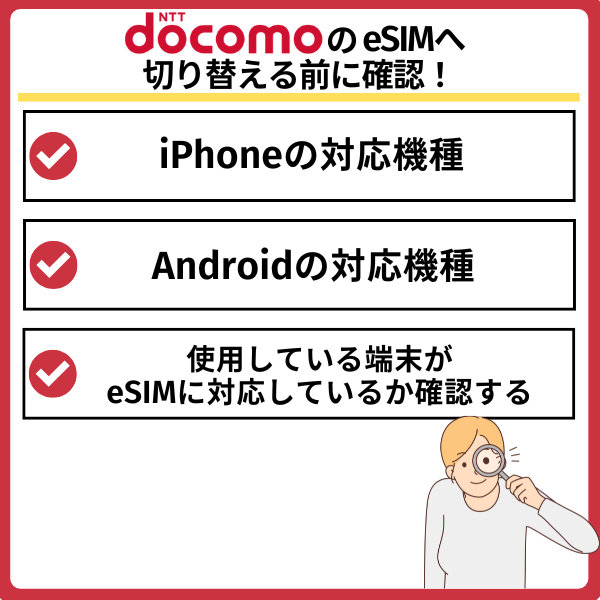 ドコモのeSIM対応機種や対応機種の確認方法をチェックしましょう。