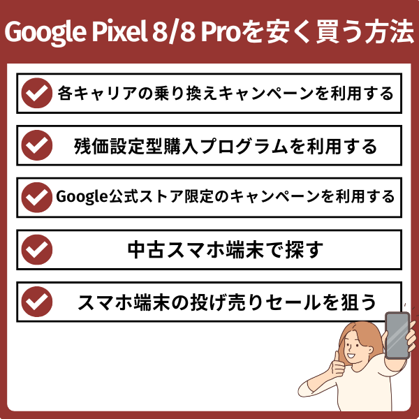 Google Pixel 8 Proの安く買う方法は以下の5つです。