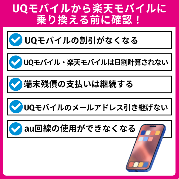 UQモバイルから楽天モバイルへ乗り換える際の注意点は以下の通りです。
