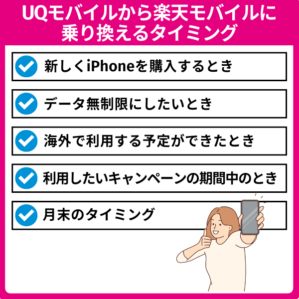 UQモバイルから楽天モバイルに乗り換えるおすすめのタイミングは以下の5つです。