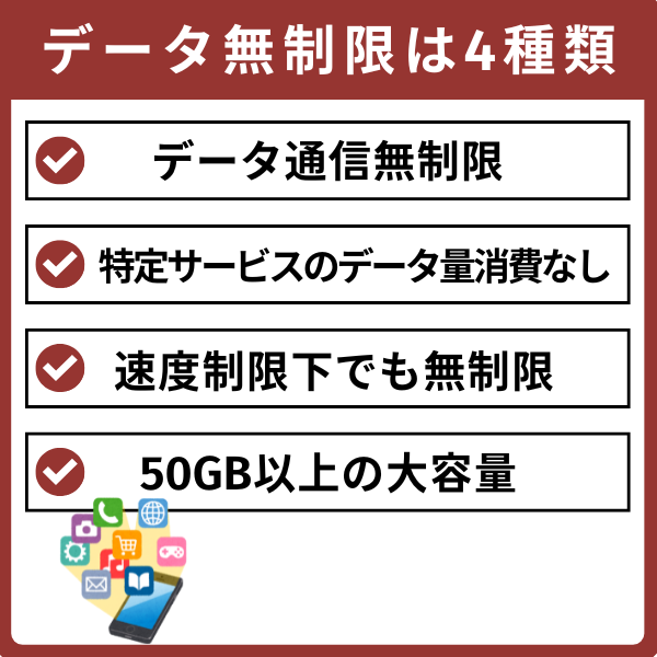 ただし、「ギガ使いたい放題」には、特定のサービス利用時のみ無制限・速度制限時のみ無制限など、条件付きの場合も。