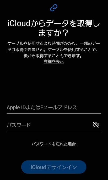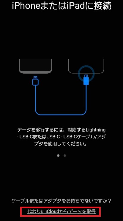 下の小さい文字のところから「代わりにiCloudからデータを取得」をタップしましょう。