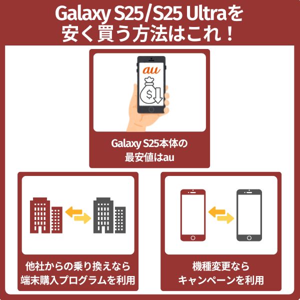 Galaxy S25/S25 Ultraを安く買う方法は、以下のとおりです。