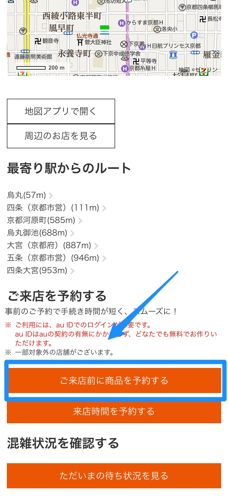 各店舗のページには「ご来店前に商品を予約する」というボタンがあります。