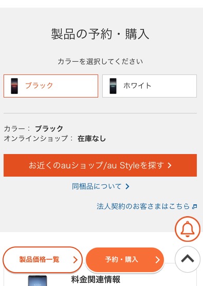 auオンラインショップで在庫がない商品は、iPhoneは予約できますが、Androidは予約ができず近くの店舗を探すように促されます。