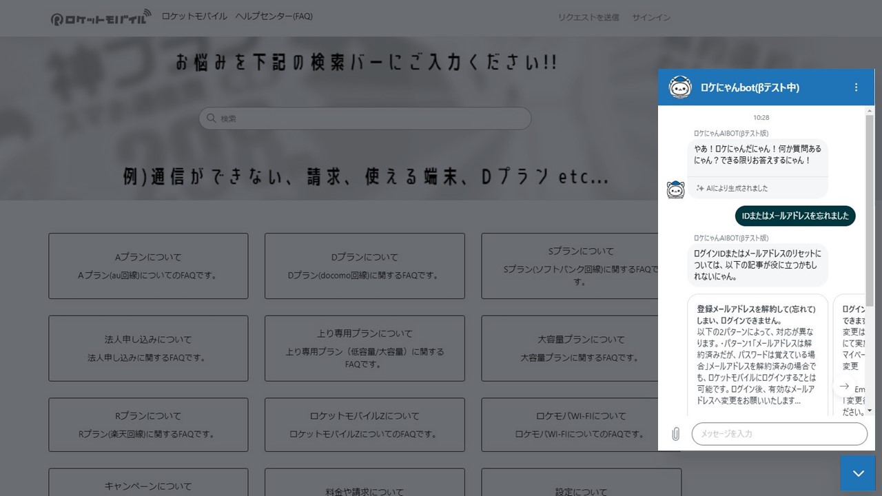 この度、ロケットモバイルヘルプセンター(https://support.rokemoba.com/hc/ja)にて、最新の生成AI技術を駆使したカスタマーサポートAIBOT「ロケにゃんBOT」を導入しました。