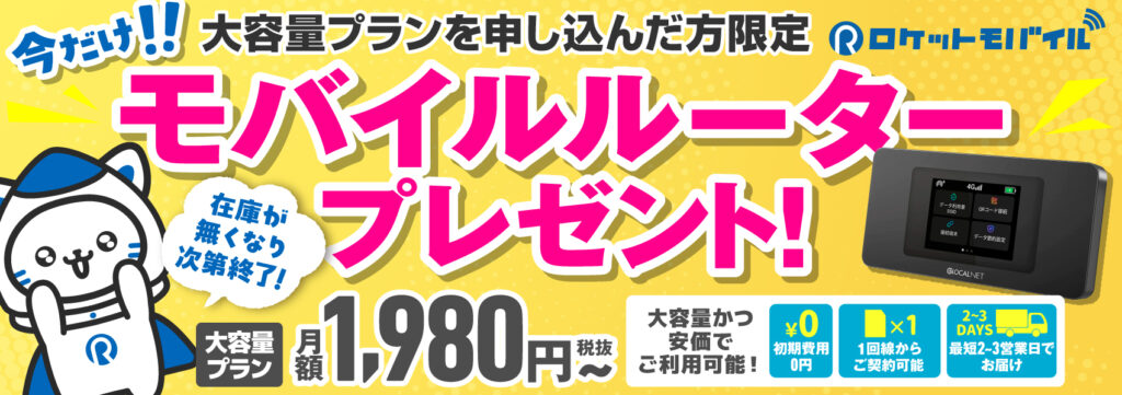 毎度ロケットモバイルをご利用いただきまして誠にありがとうございます。 この度、大容量プランをお申込みいただいた方にモバイルルーターを無料でプレゼントするキャンペーンを実施いたします。