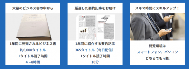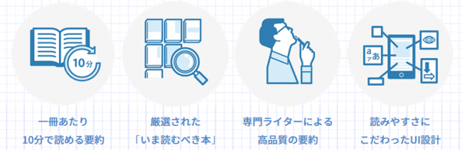 1. 一冊当たり10分で読める要約:全ての本が、通勤途中や休憩時間などのスキマ時間に読める分量と、概要を把握できる最小限の分量の最適解(=10分)で読了可能