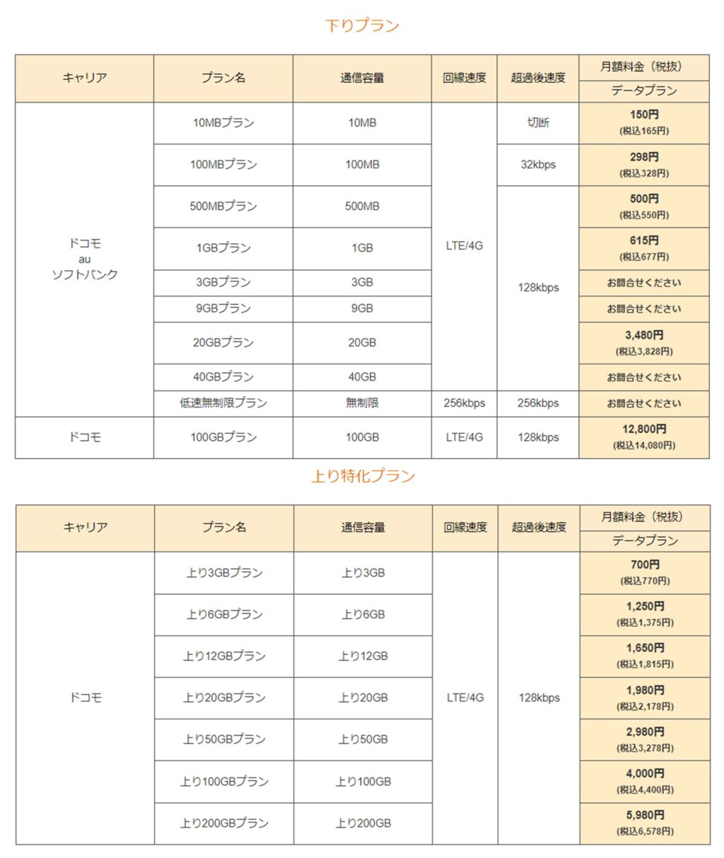 ※上り特化3~50GBプランにつきまして、下り利用料が0.5GBを超えた場合、事前通知の上、利用停止もしくは下り利用量が規定量を超えないようにご対応をお願いする場合がございます。